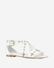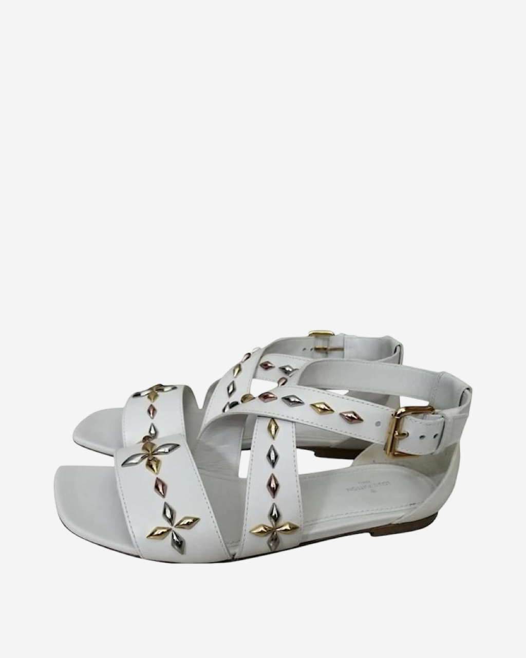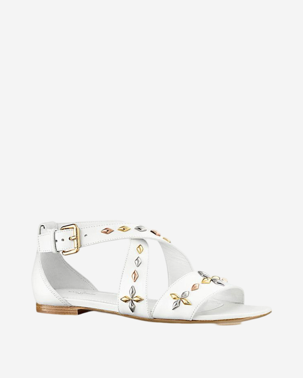 - Descripción: Sandalias en piel color crema con detalles en studs dorados y plateados, puntera cuadrada, ajuste con broche al tobillo
