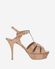 - Descripción: Sandalias irónicas Saint Laurent en piel color beige, puntera cuadrada, tacón de aguja, ajuste con broche al tobillo, hardware color dorado
