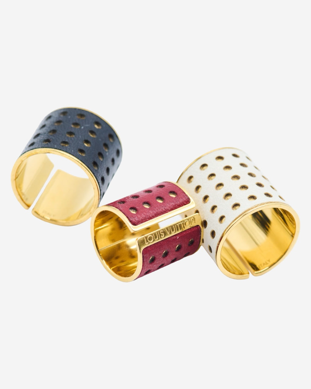 - Descripción: Anillos Louis Vuitton, bisutería, cubierta de piel perforada en color vino, blanco y negro, logo característico grabado