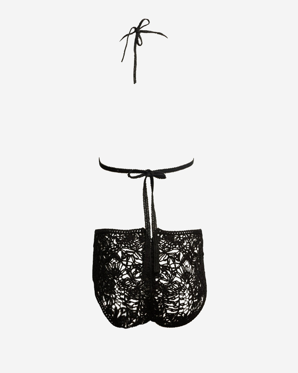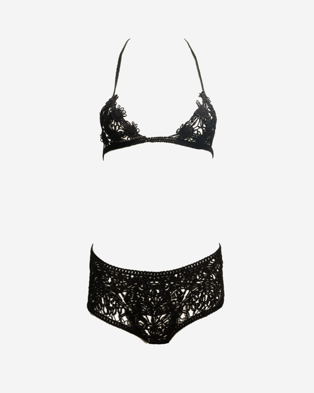 • Descripción: Set de playa en color negro, shorts minis tejidos a la cadera con zipper en la parte trasera, y top con ajuste al cuello