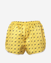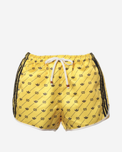 - Descripción: Shorts cortos en tono amarillo con logo característico, rayas en los laterales, ajuste con cordón
