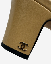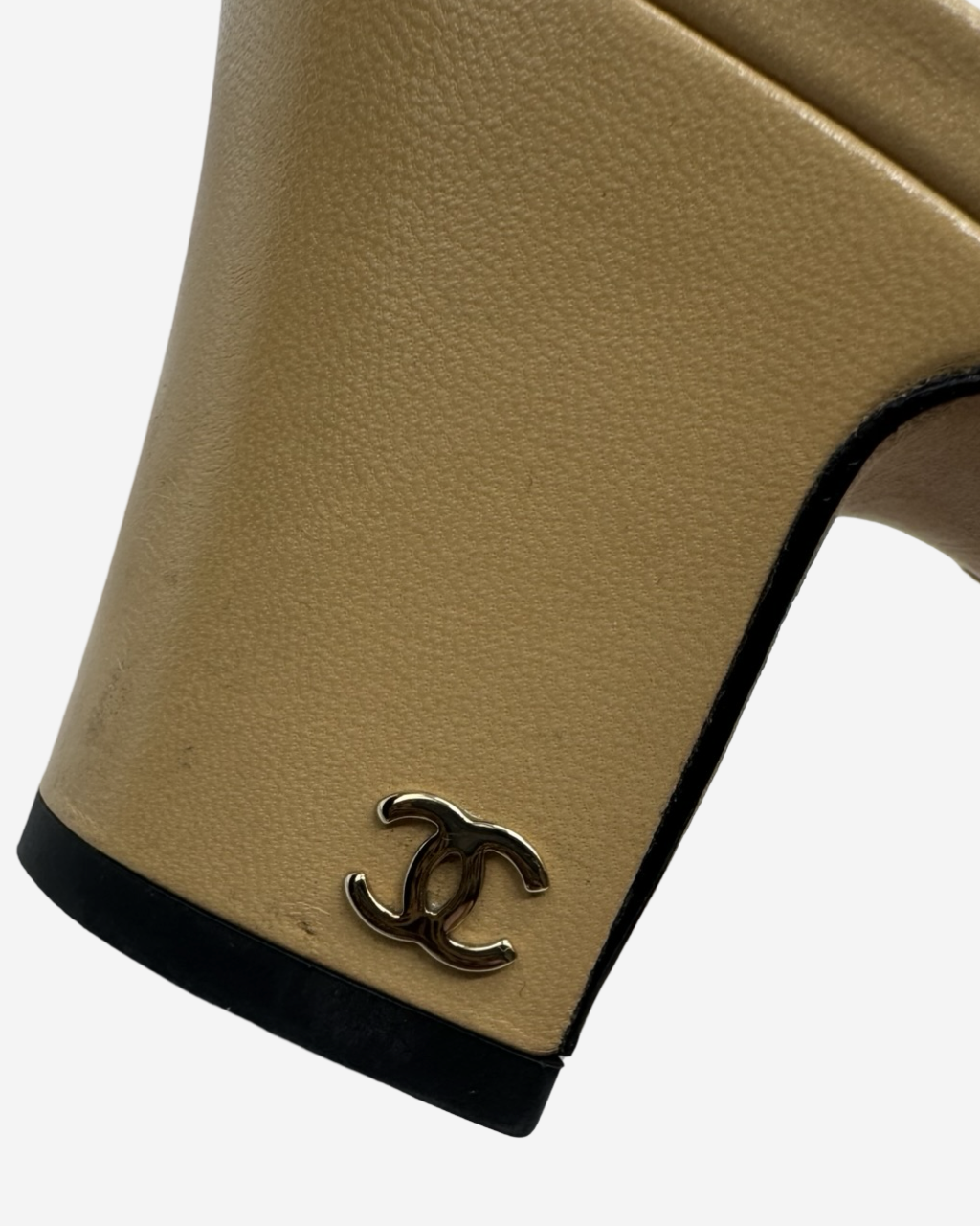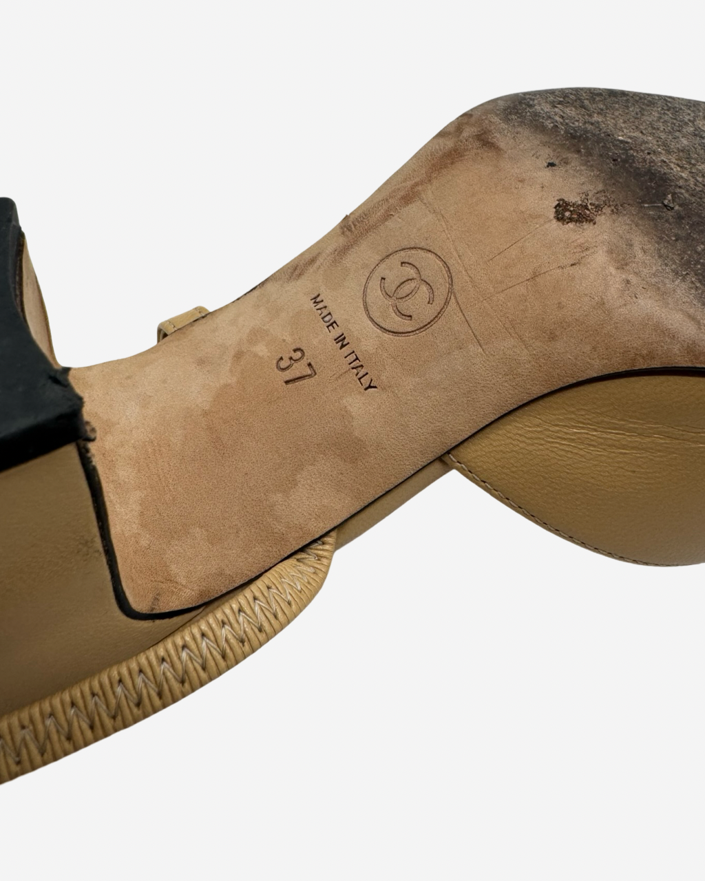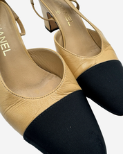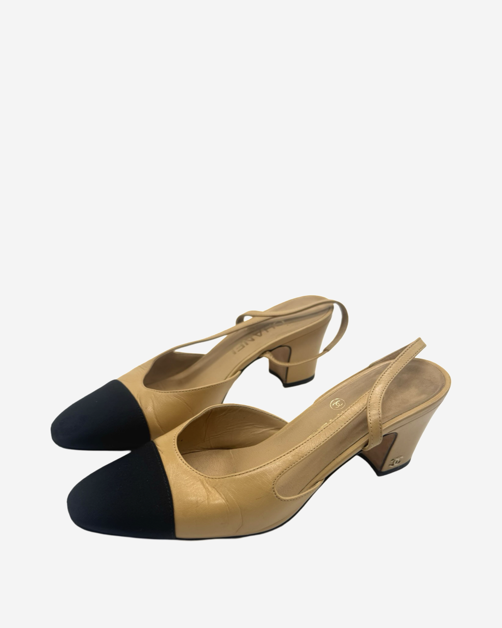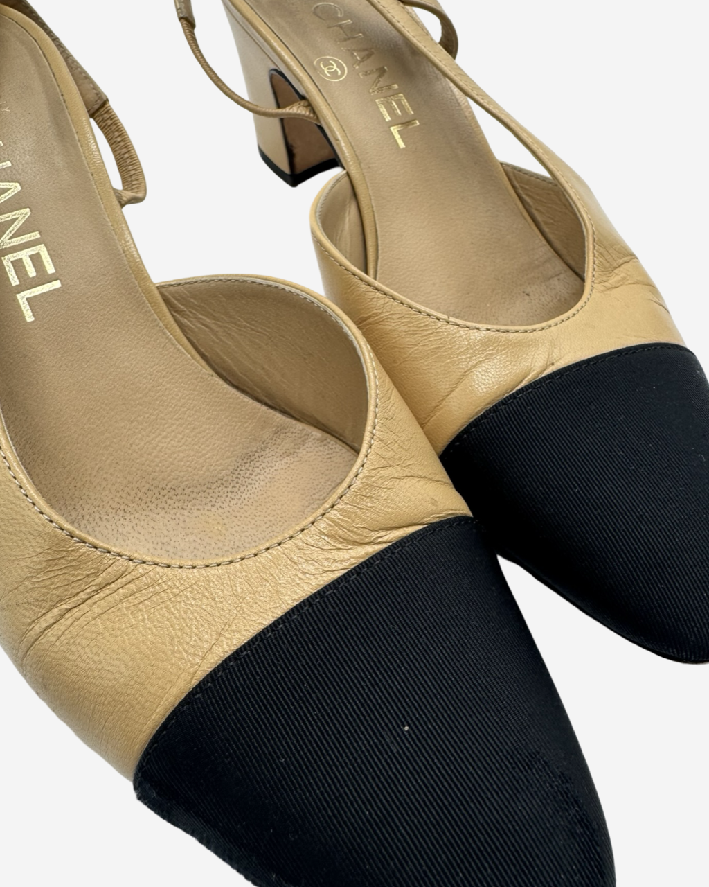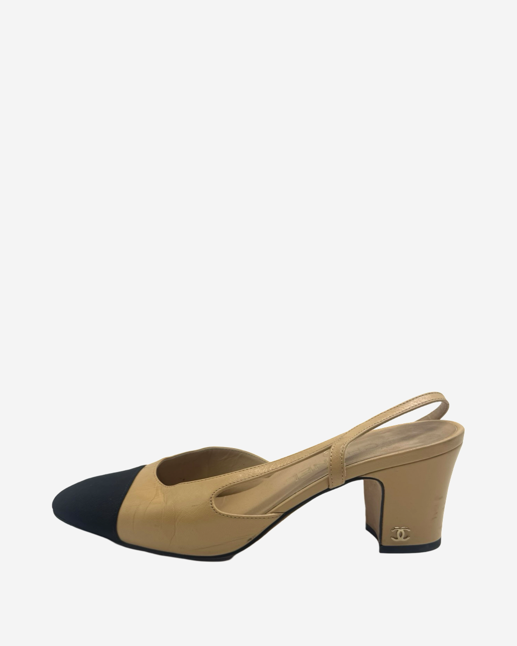 - Descripción: Slingbacks en piel color beige con punta en tono negro, ajuste con strap elástico al talón, placa CC en el tacón, hardware dorado