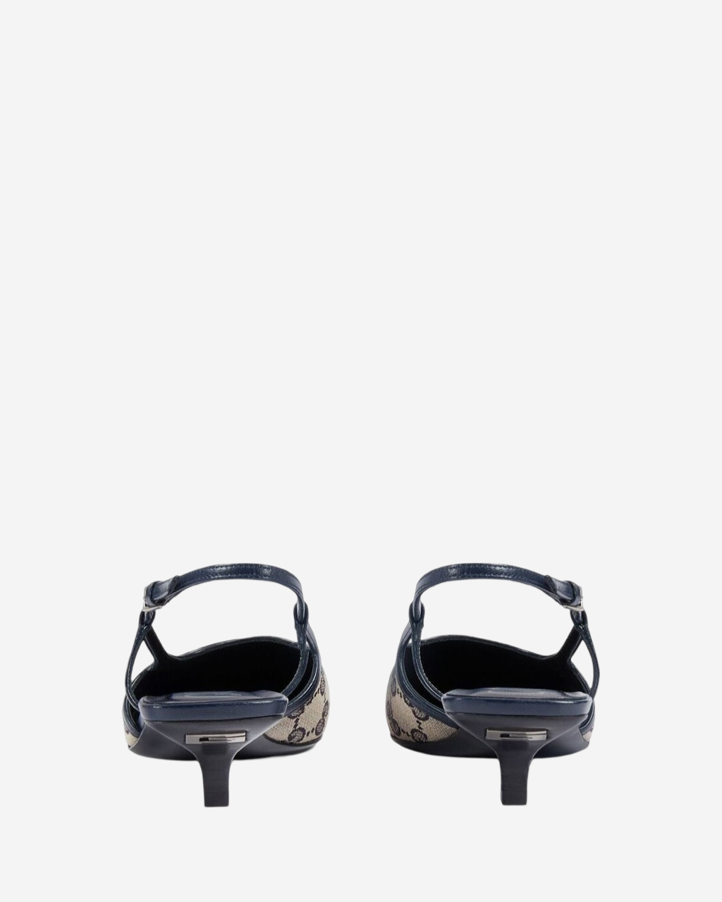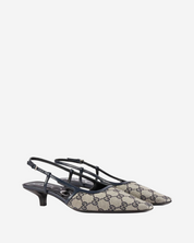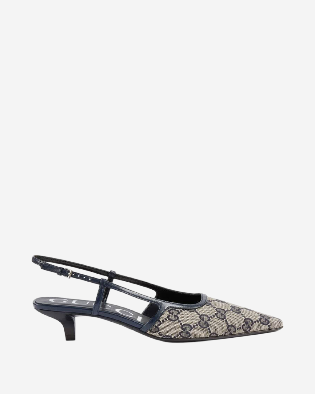 - Descripción: Slingbacks Gucci en canvas con puntera cuadrada, tacón de 35mm, ajuste con broche