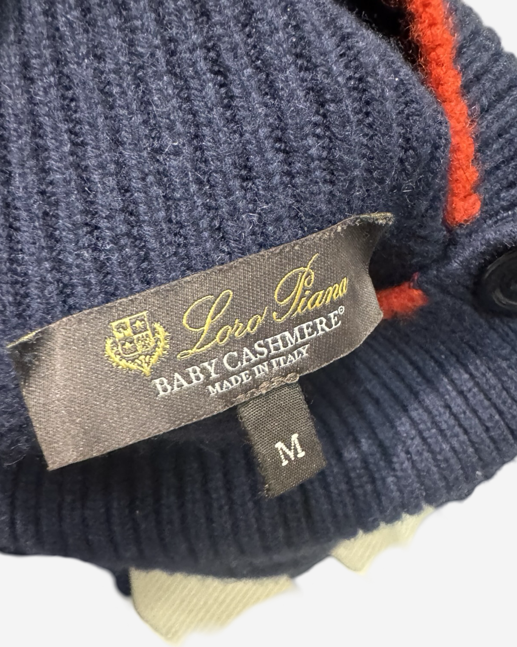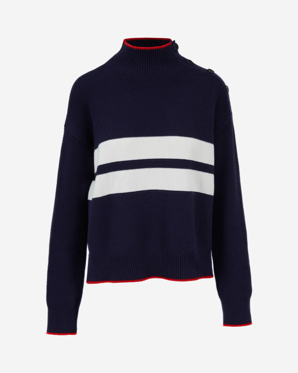 - Descripción: Suéter de rayas en color azul, cuello alto, manga larga, ribetes en tono rojo, detalle de botones en un costado
