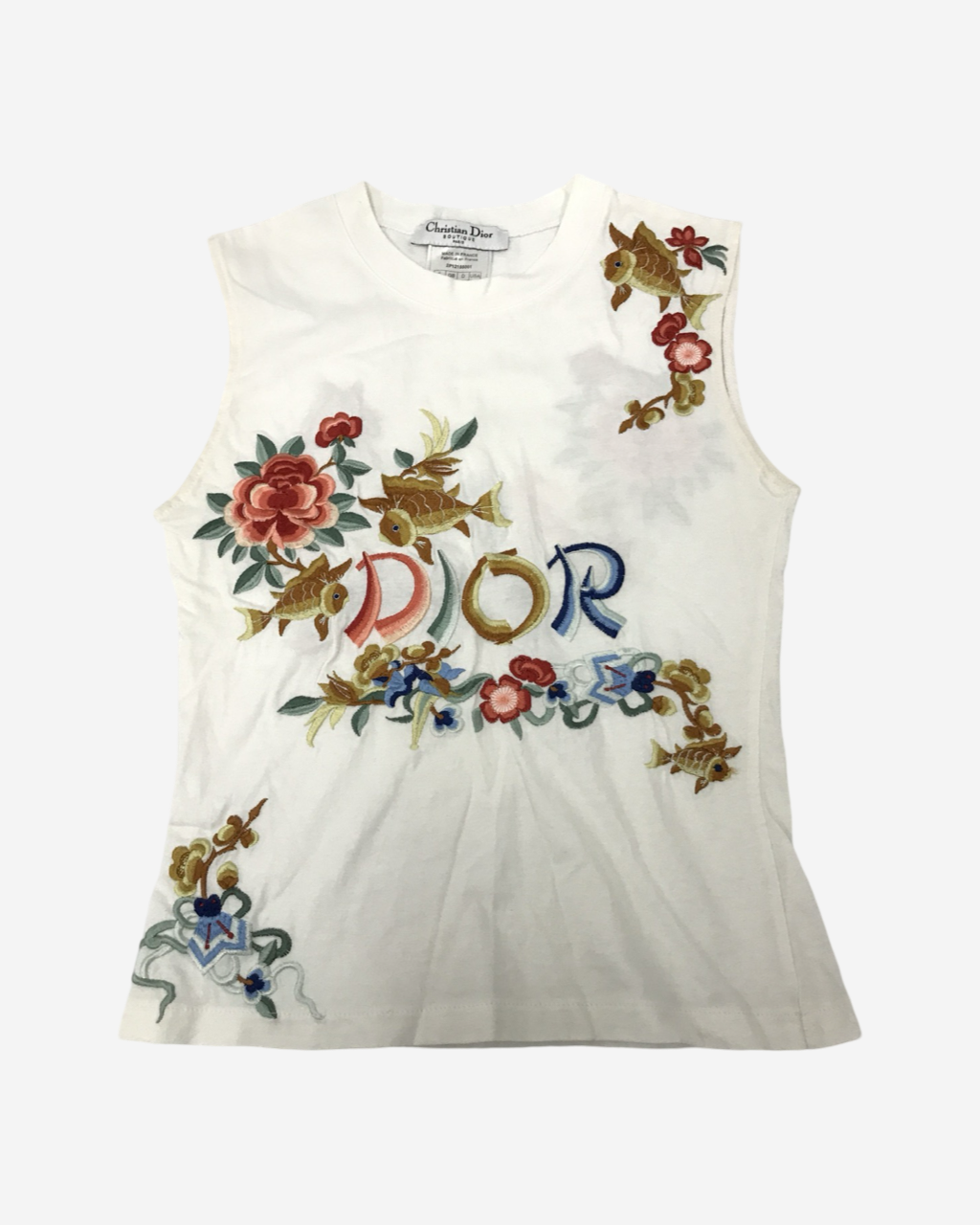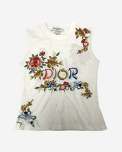 • Descripción: Top Dior John Galliano vintage sin mangas en algodón, logo frontal con detalles florales, cuello redondo