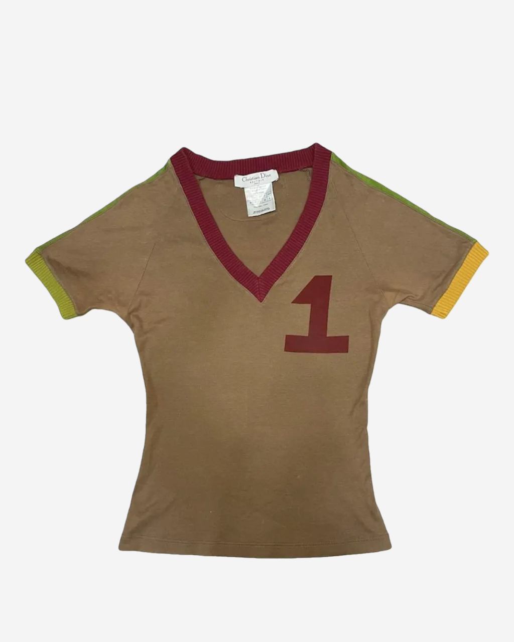 • Descripción:  T-Shirt Dior rasta en color café, detalles de ribetes en color verde, rojo y amarillo, cuello V