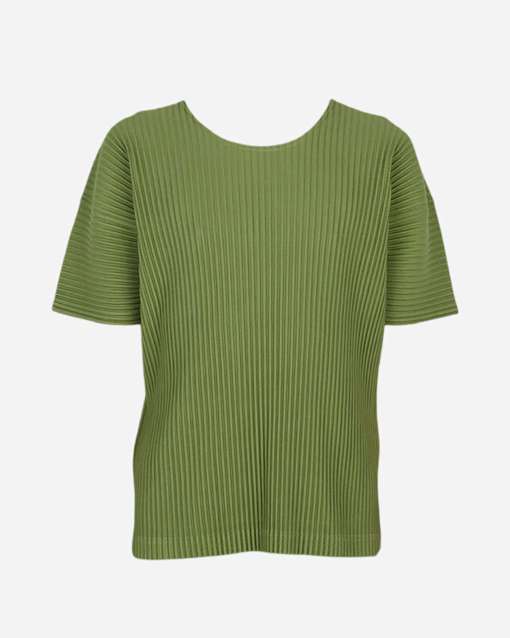 • Descripción: Camisa plisada en color verde, manga 3/4, cuello redondo, corte relaxed