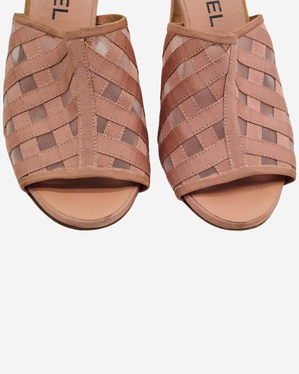 - Descripción: Sandalias de tacón Chanel en material textil color rosa, puntera redondeada, pánel de mesh con listón en forma de cuadros, placa de logo 'CC' característico en la parte posterior