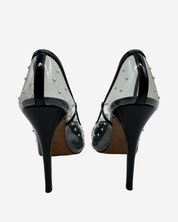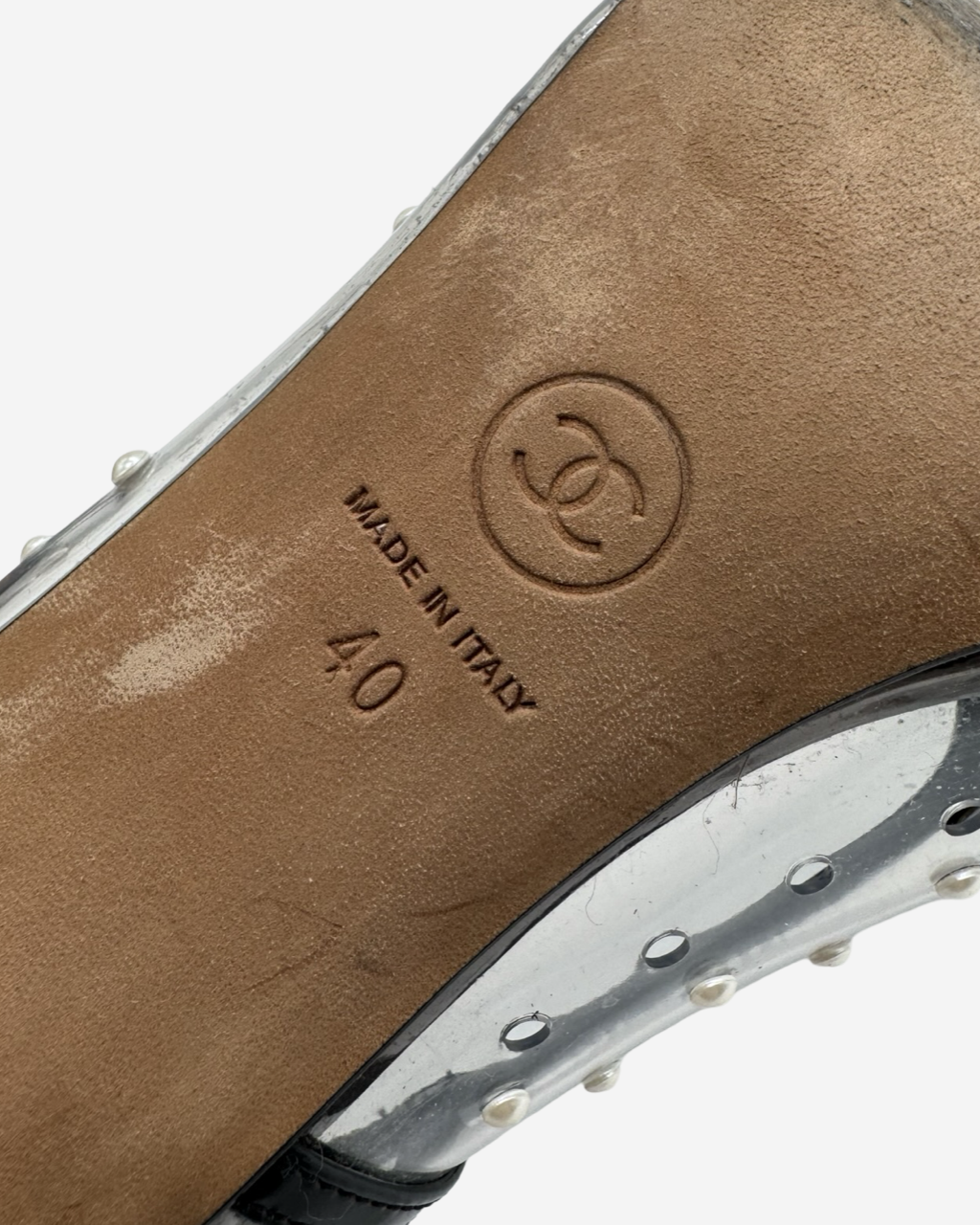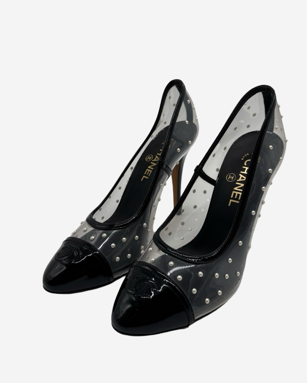 - Descripción: Tacones en charol con logo CC bordado frontal, páneles en PVC con perlas incrustadas, tacón delgado