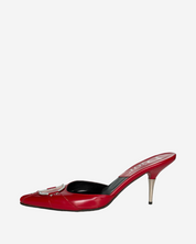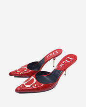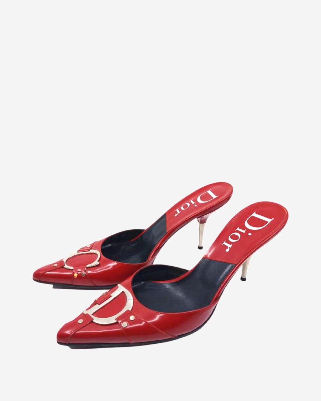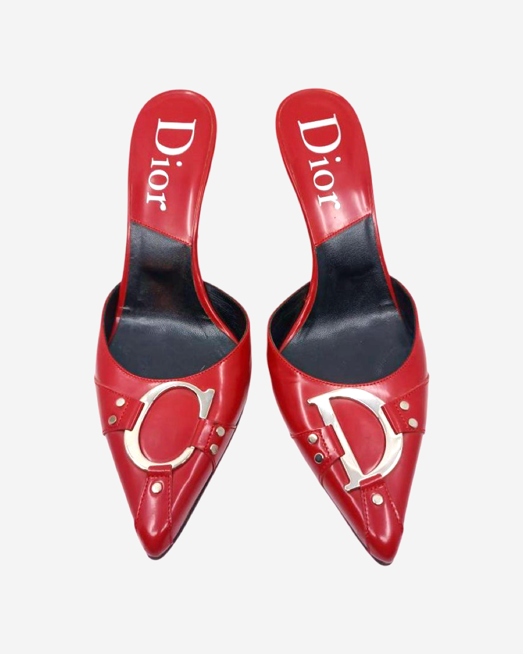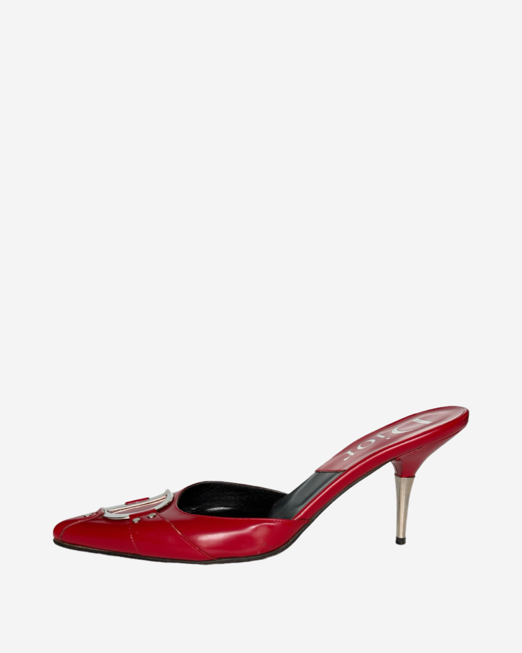- Descripción: Mules de Tacón en piel color rojo, puntera puntiaguda logo 'C' y 'D' característico, tacón delgado con detalle metálico, hardware color plateado