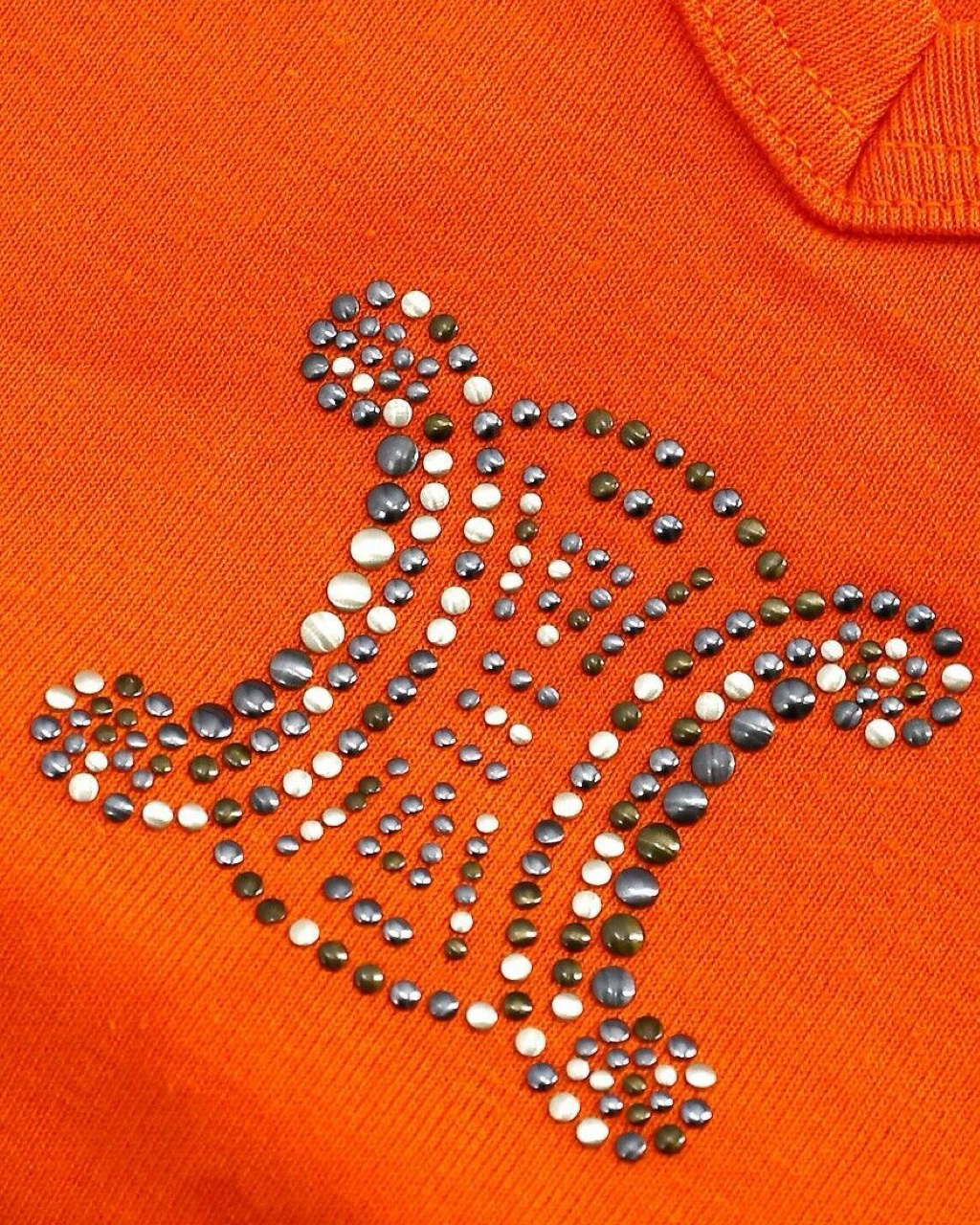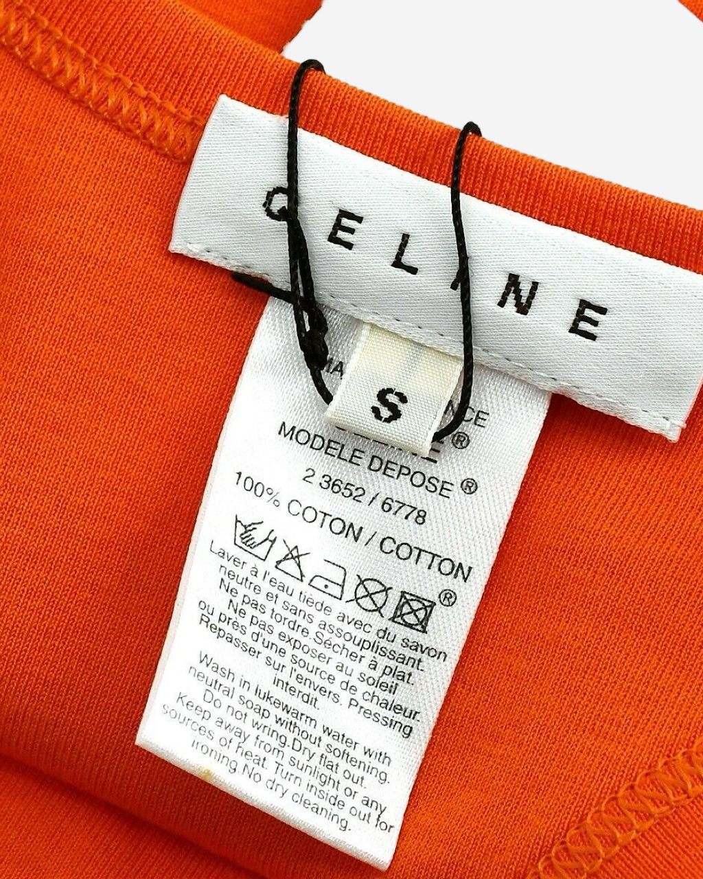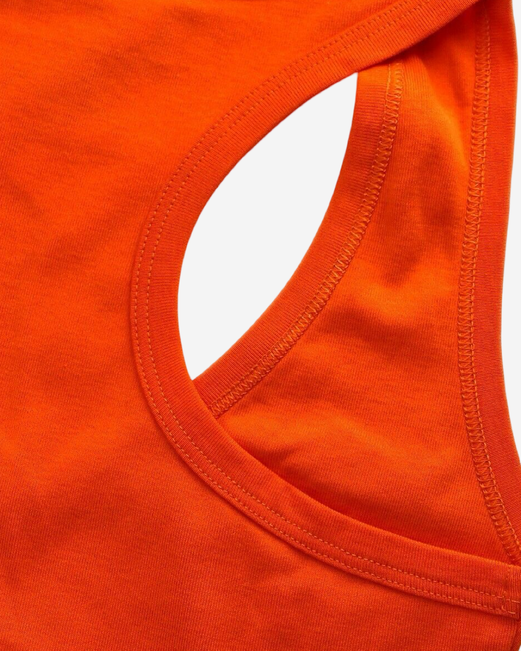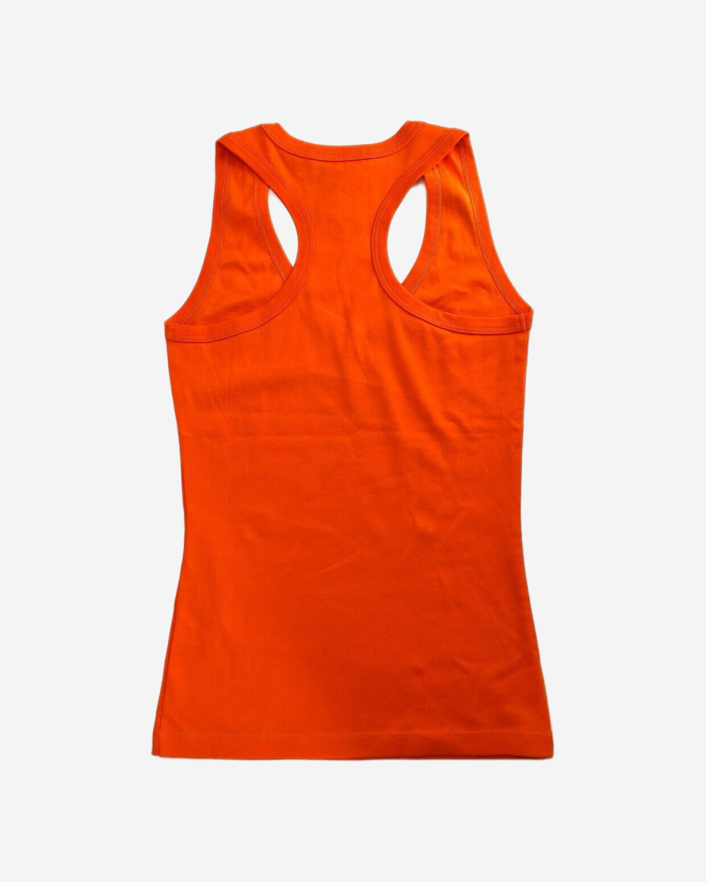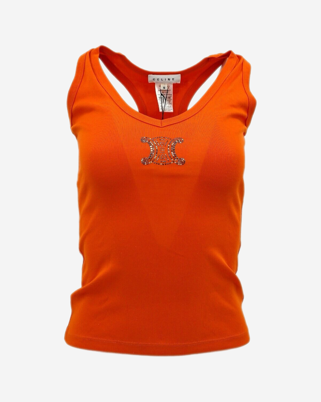 - Descripción: Tank Top Celine en algodón color naranja, logo con rhinestones color dorado característico