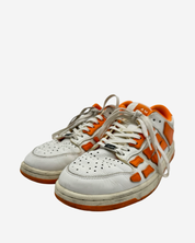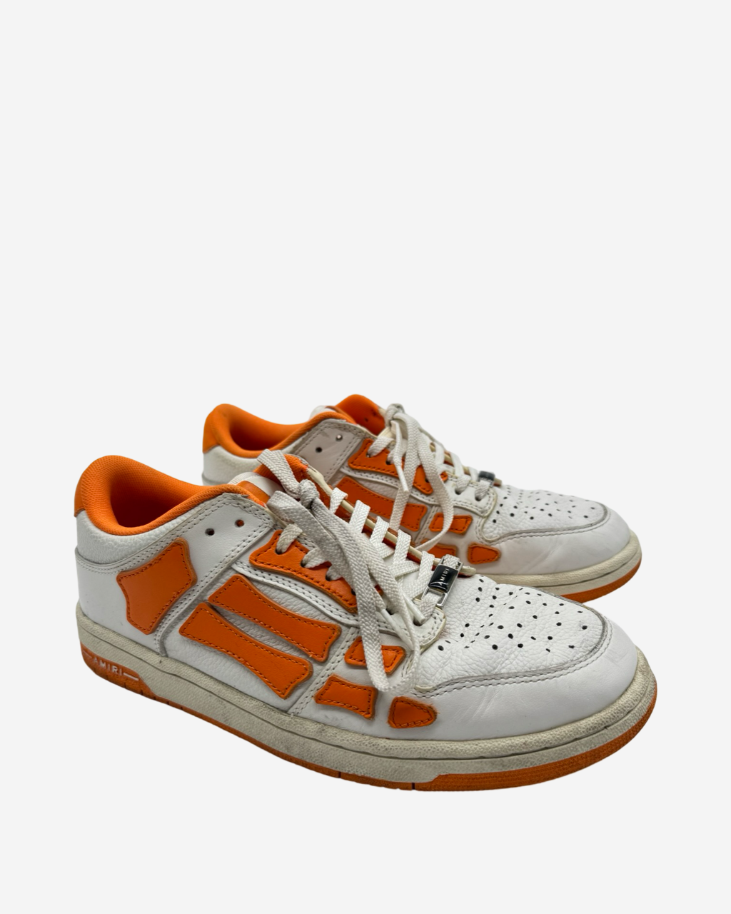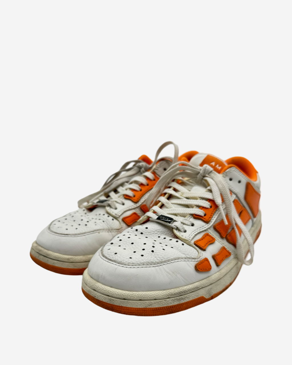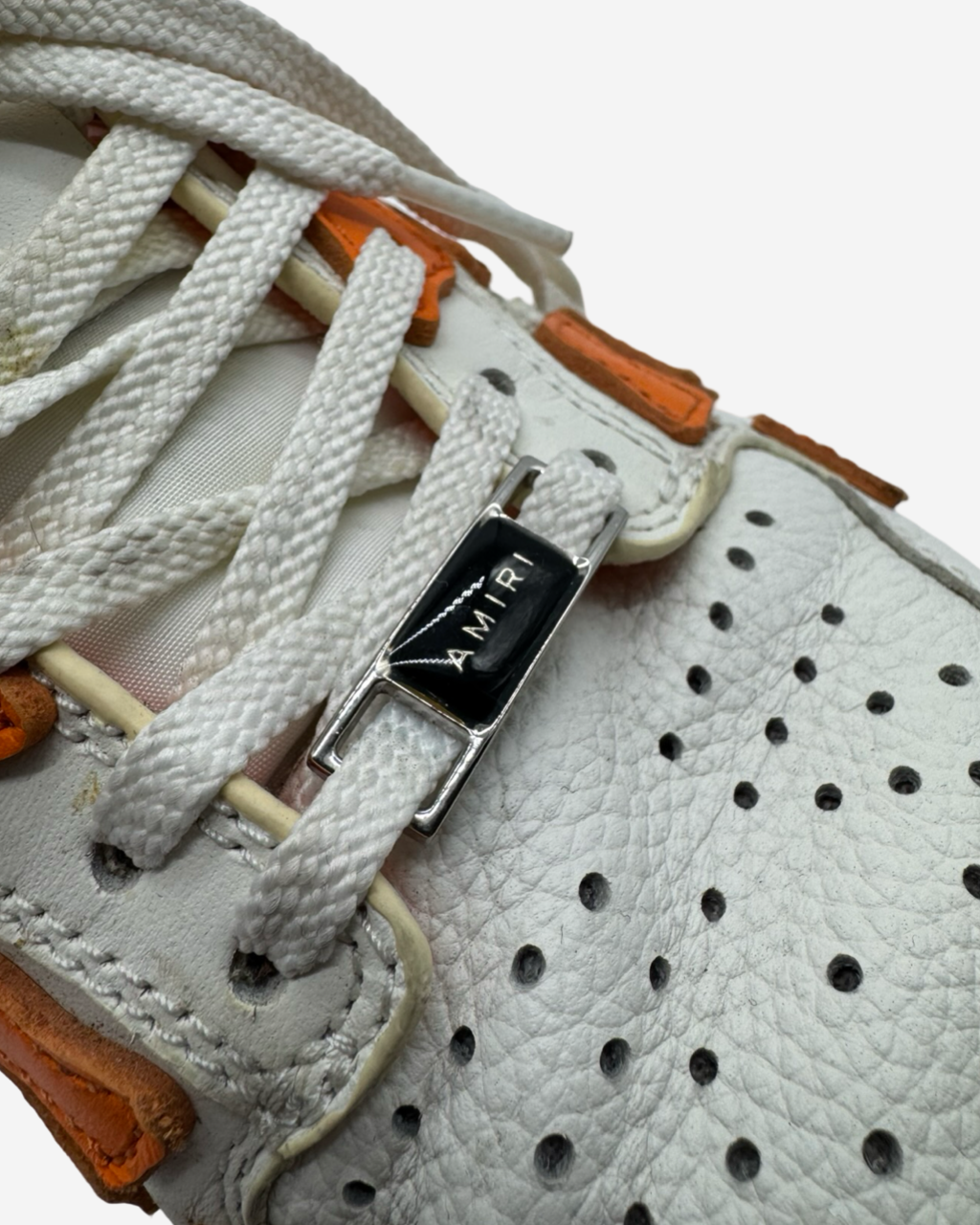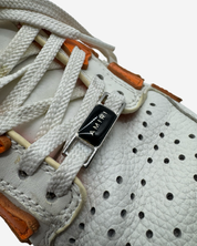 - Descripción: Tenis en piel color blanco con detalle de skull en color naranja, puntera redondeada, ajuste con agujetas, suela de goma