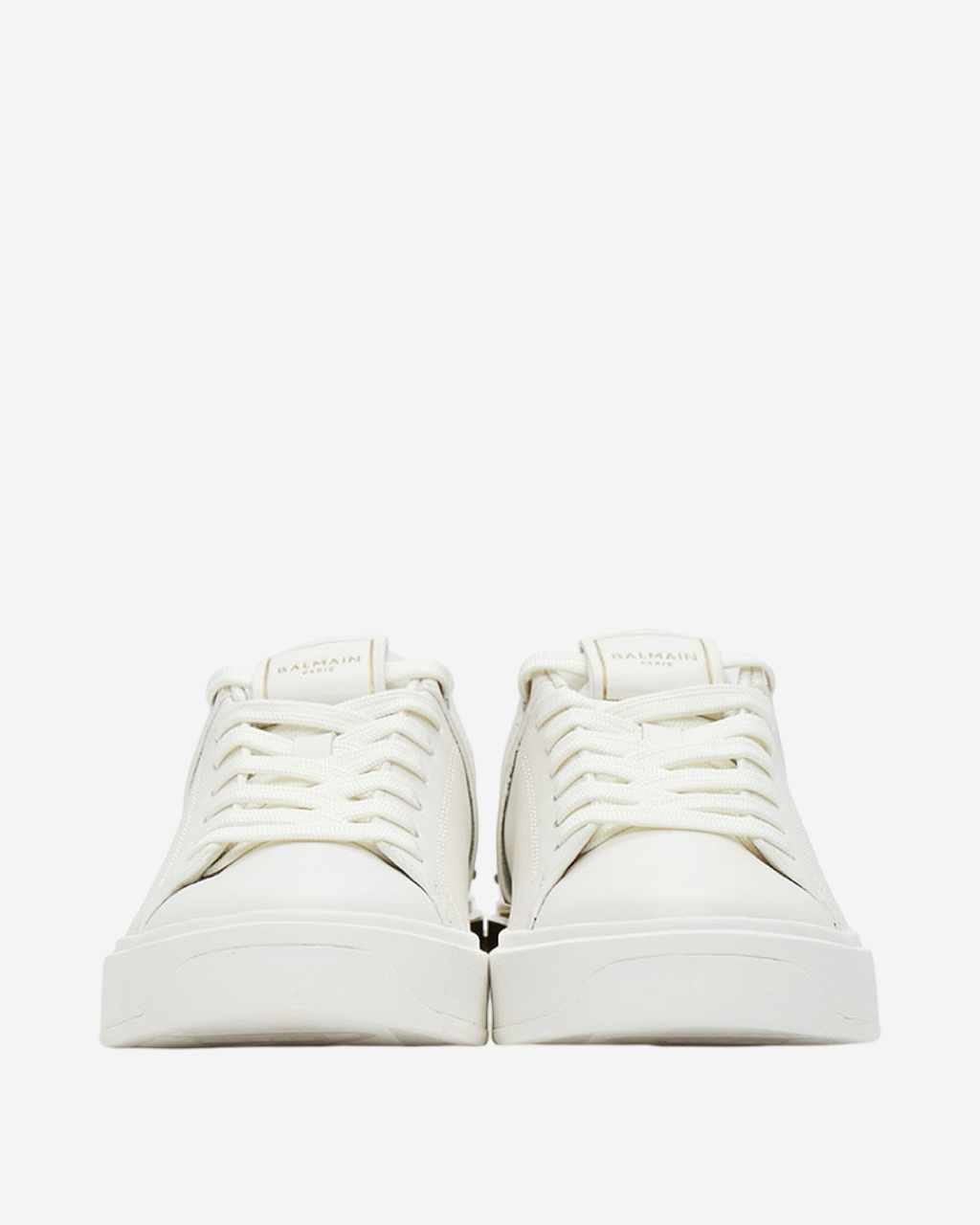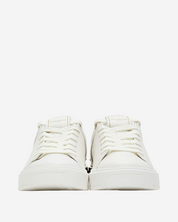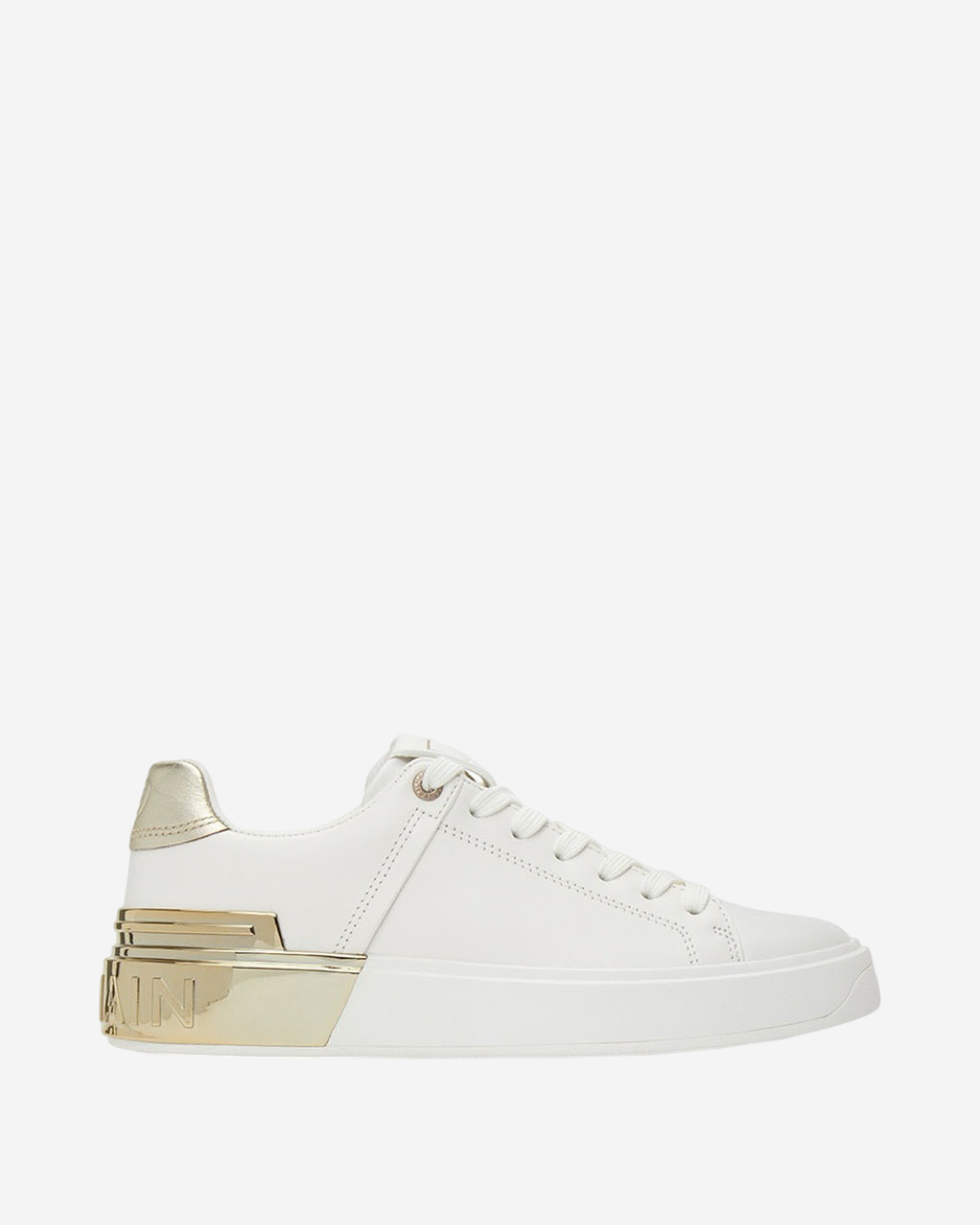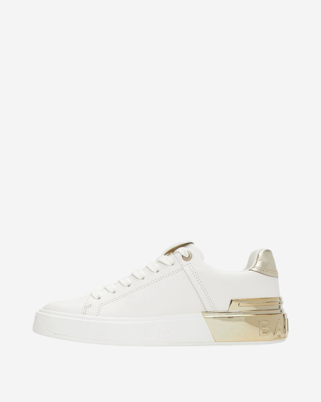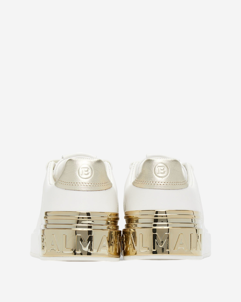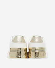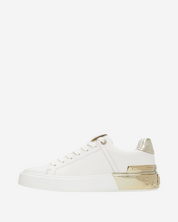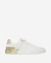 • Descripción: Tenis en piel color blanco, puntera redonda, detalles en piel color dorado, placa con logo característico en parte trasera