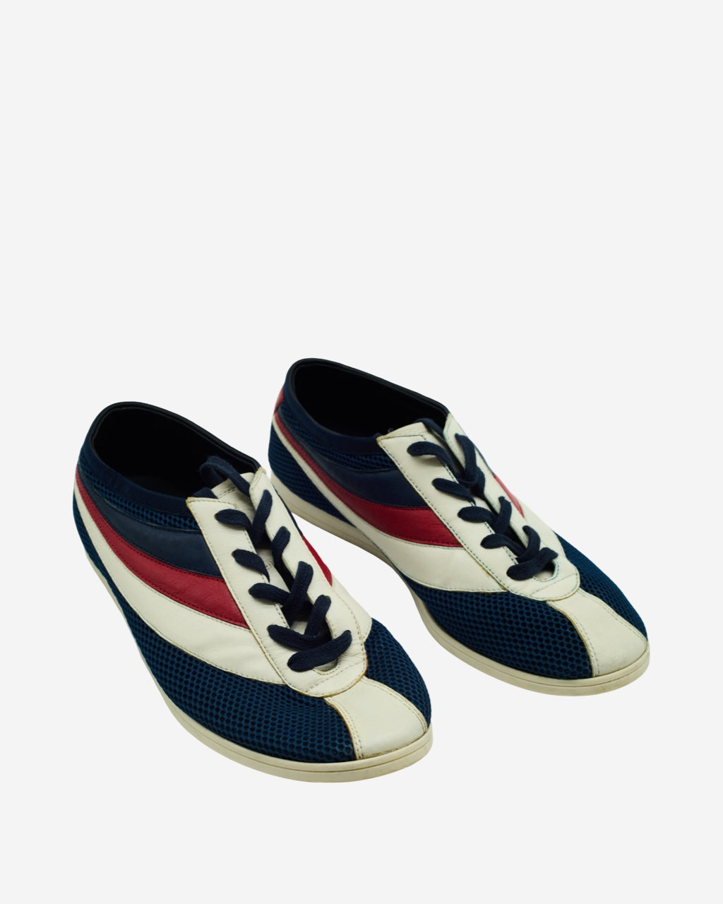 - Descripción: Tenis Gucci Ace en material textil color azul, puntera redondeada, motivo de ribete tricolor en los laterales, ajuste con agujetas suela de goma