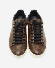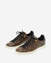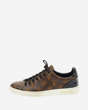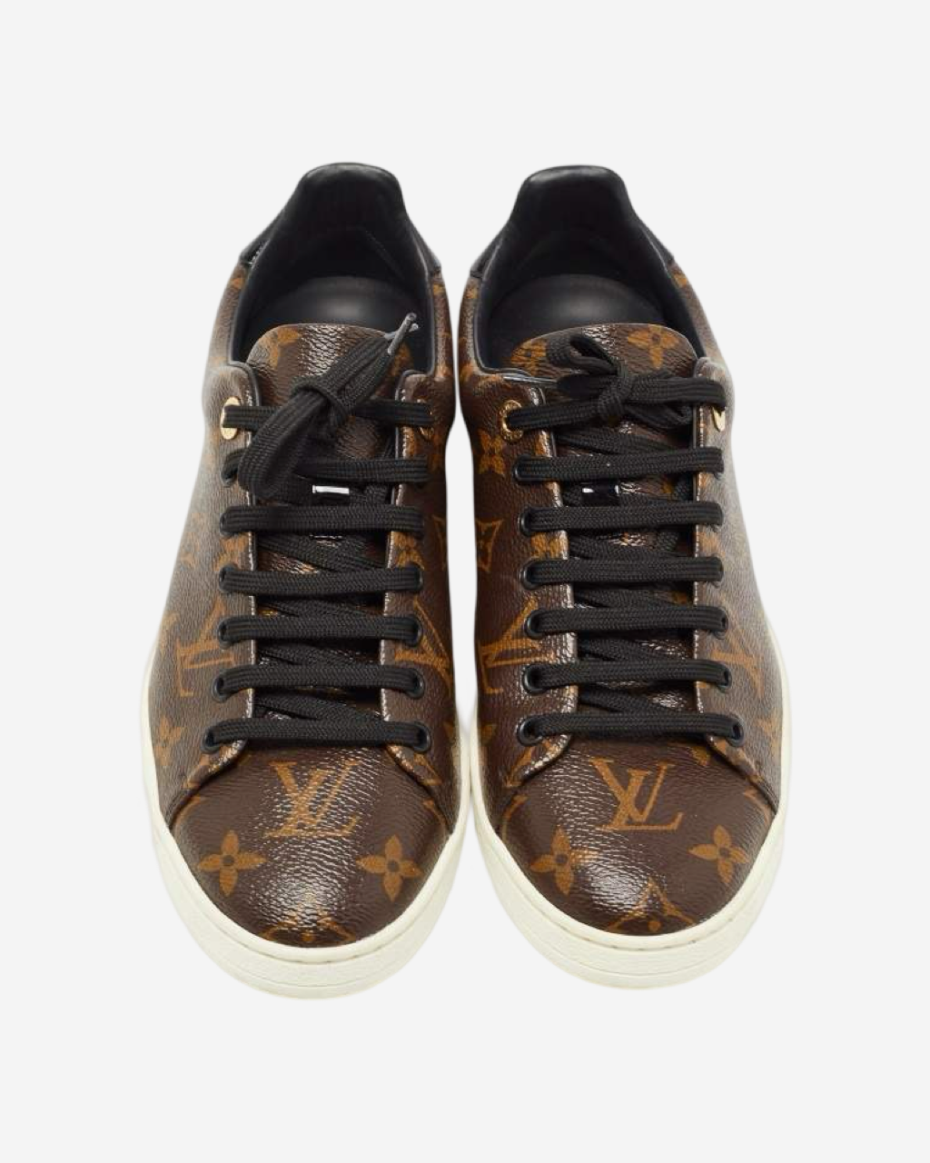 - Descripción: Tenis en canvas monogram color café, detalles en piel color negro, puntera redondeada, ajuste de agujetas
