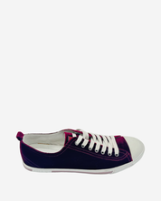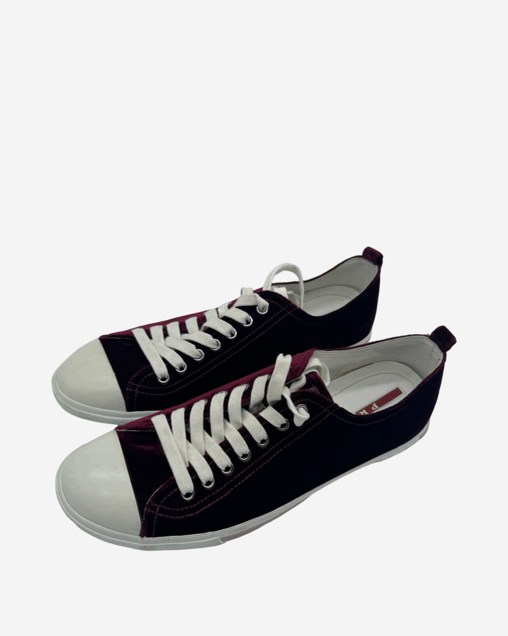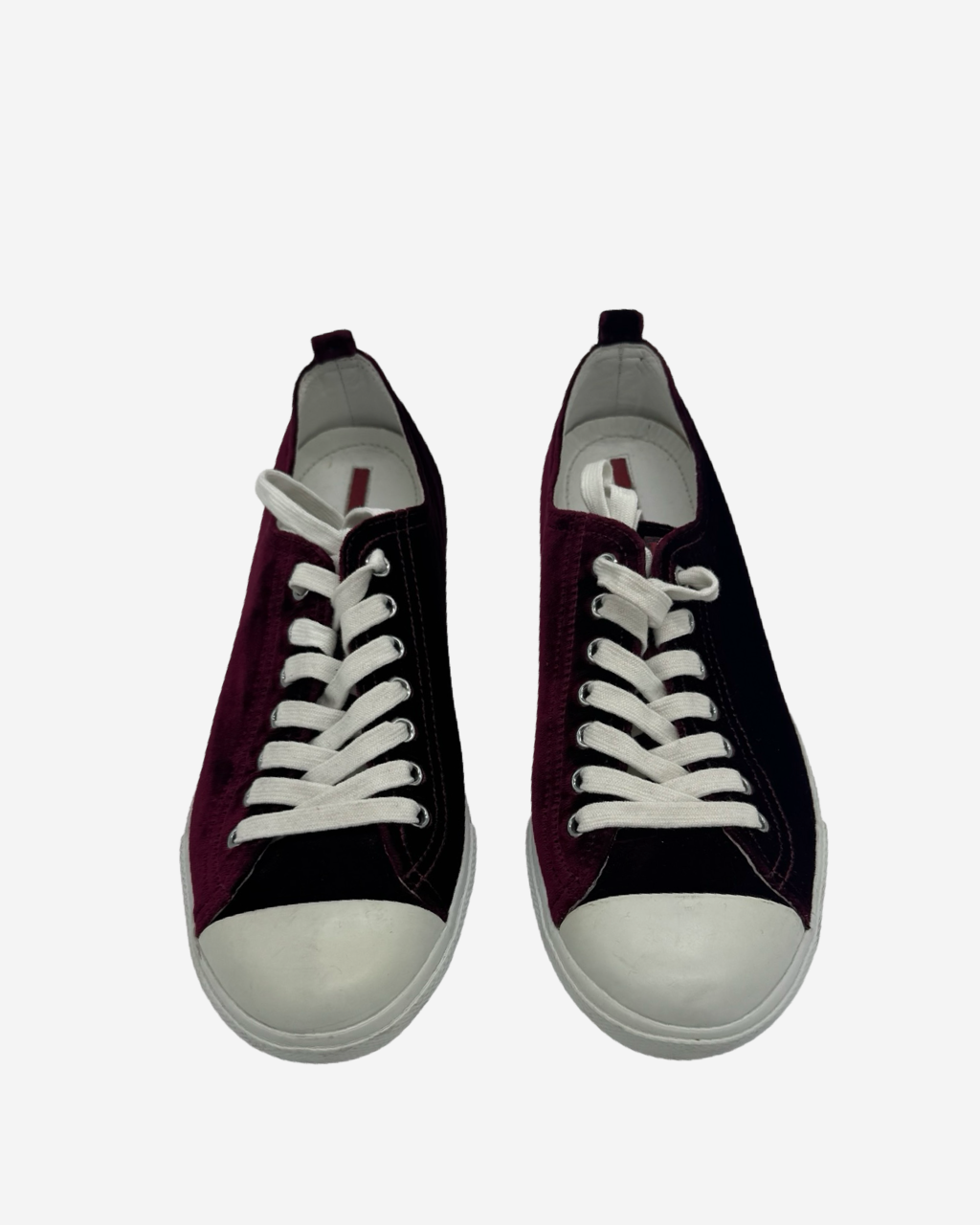 - Descripción: Tenis en terciopelo color rojo, puntera y suela de goma en color blanco, ajsute con cordones