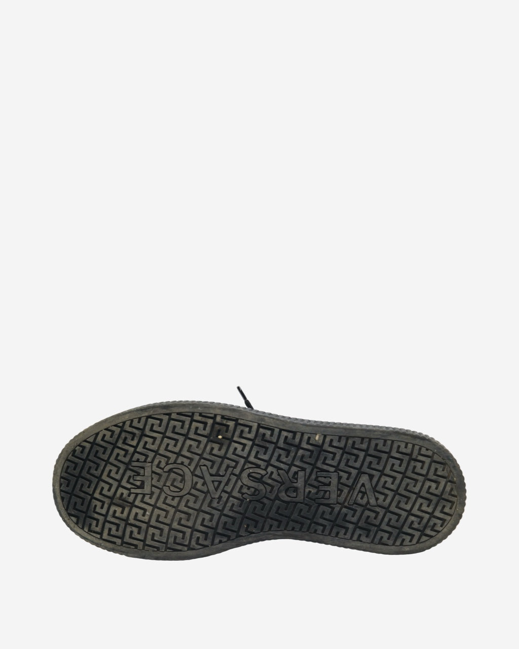 - Descripción: Tenis Versace de piel en color negro, puntera redondeada con medusa en 3D, logo en los laterales en tono rojo, ajuste con agujetas, suela de goma