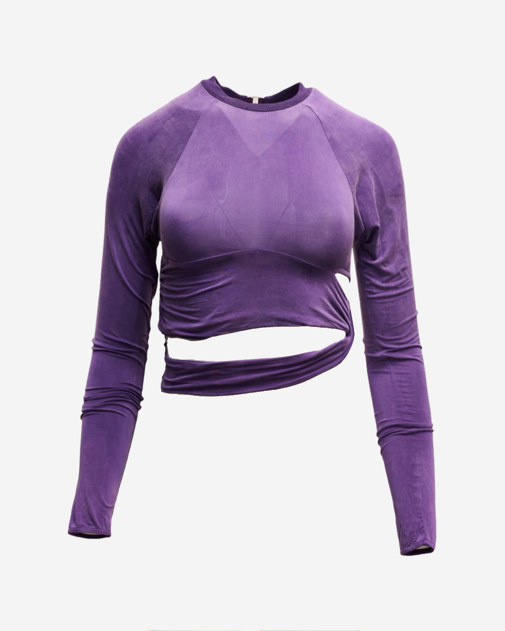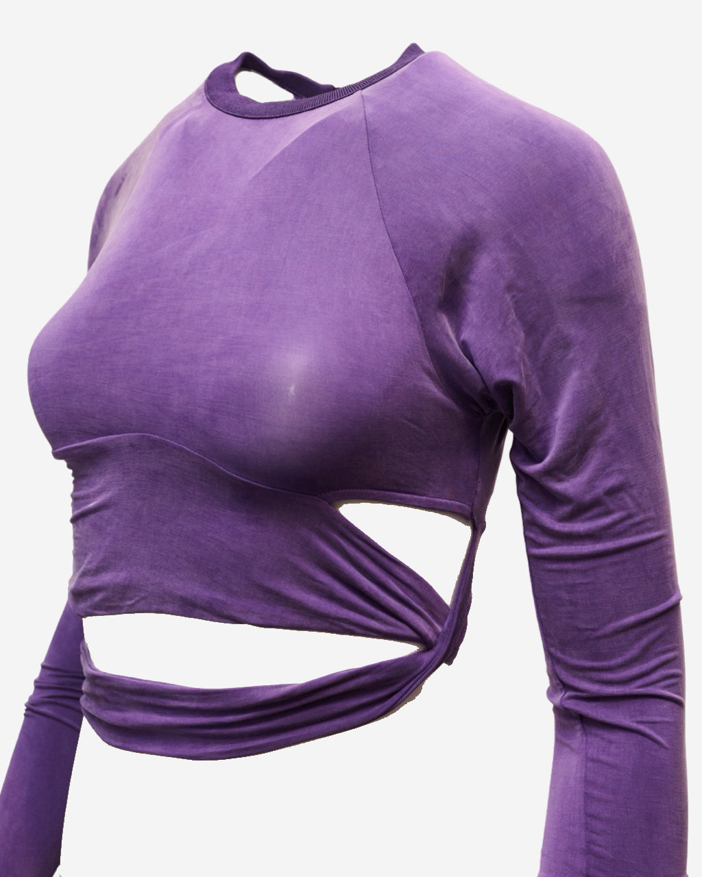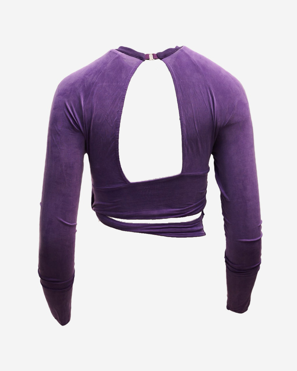 - Descripción: Top de manga larga en color morado, cuello redondo, motivo de cutout en el lateral, efecto rutched, espalda descubierta y broche metálico en la parte trasera del cuello