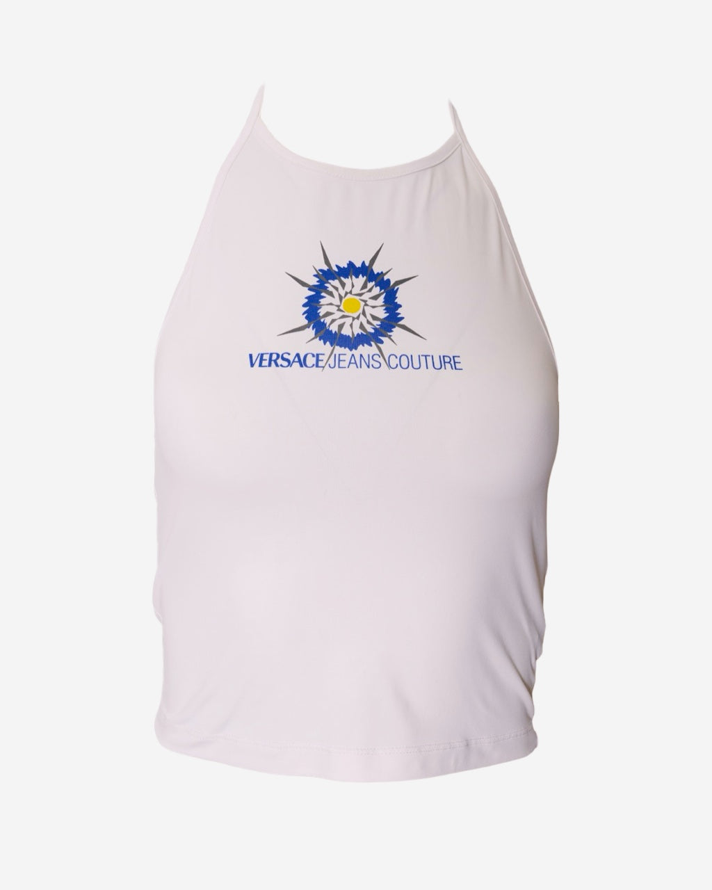 - Descripción: Top Versace en color blanco, tipo halter, print frontal en color azul, corte recto
