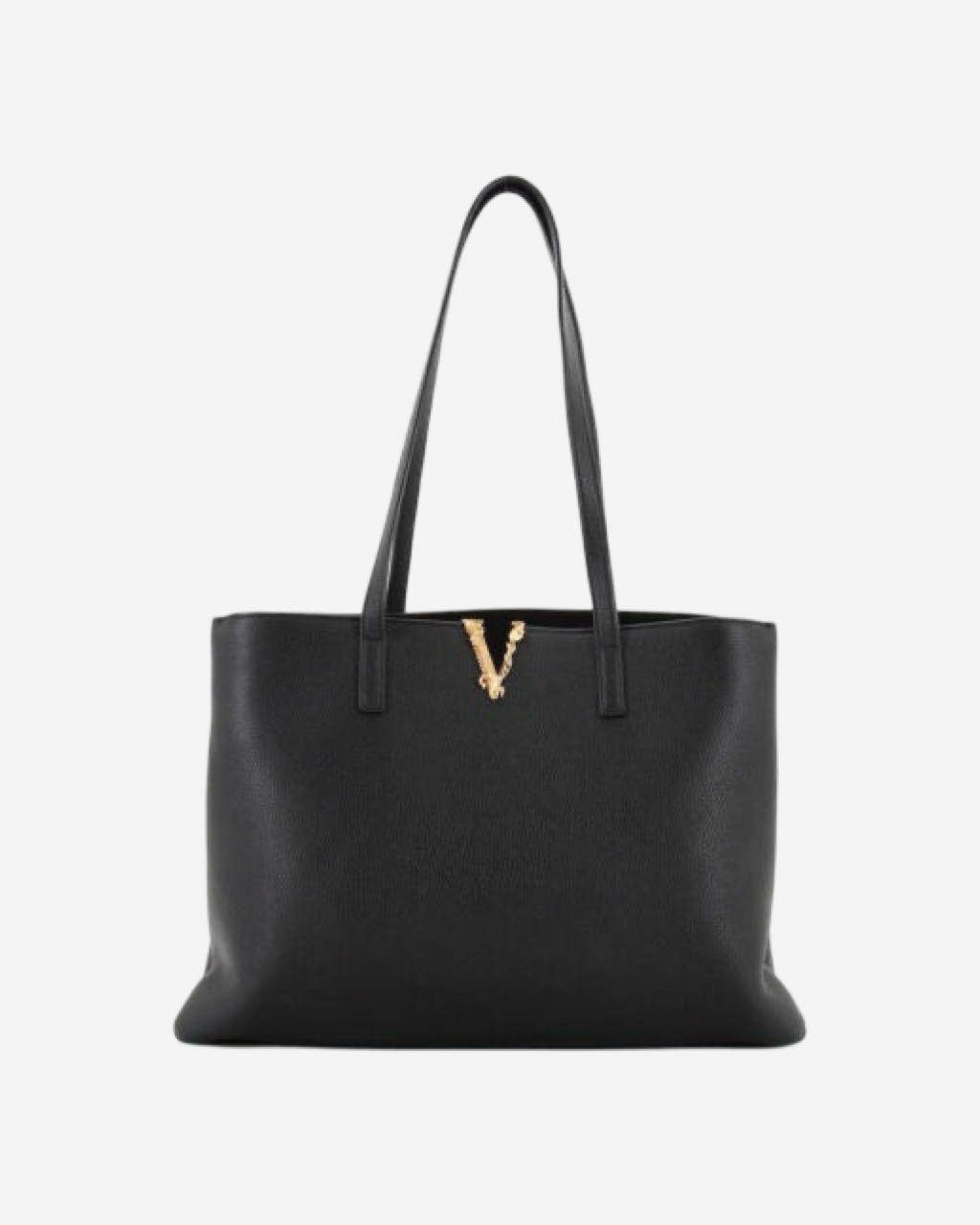 • Descripción: Bolsa Versace en piel color negro, doble asa fija, logo V característico, hardware color dorado