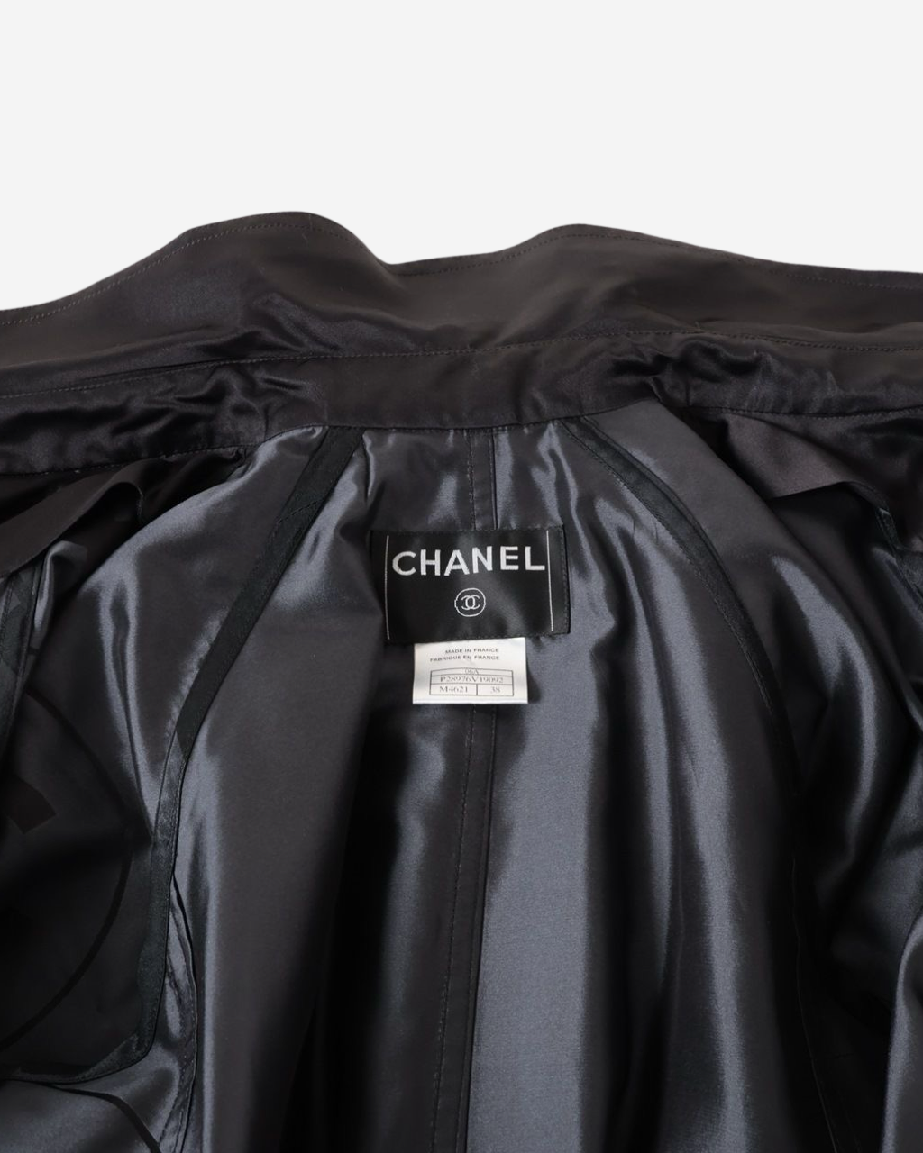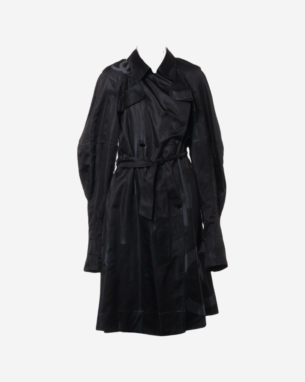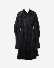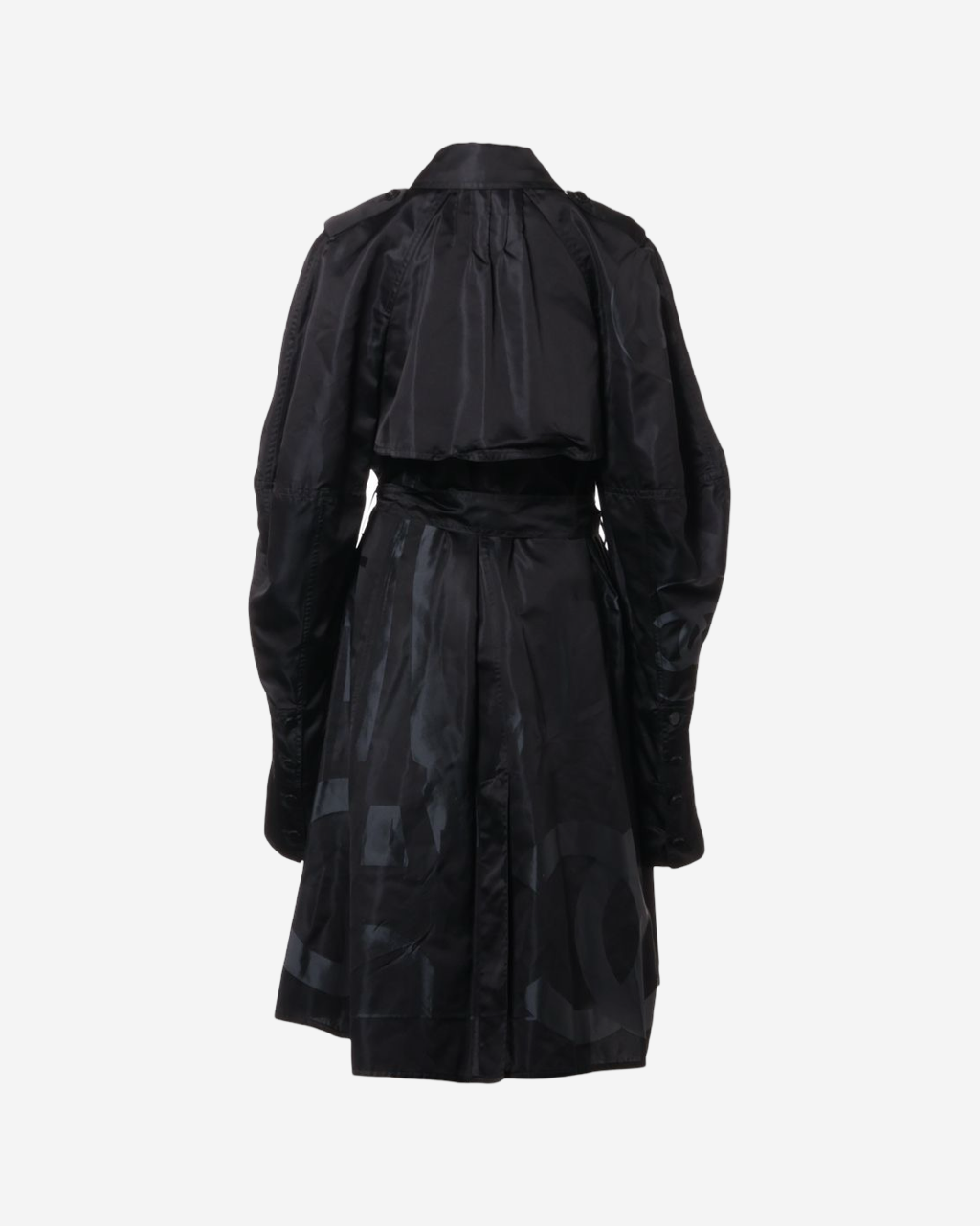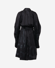 - Descripción: Trench Coat largo en seda color negro con print de ciudad, ajuste con cinturón a la cintura, manga larga