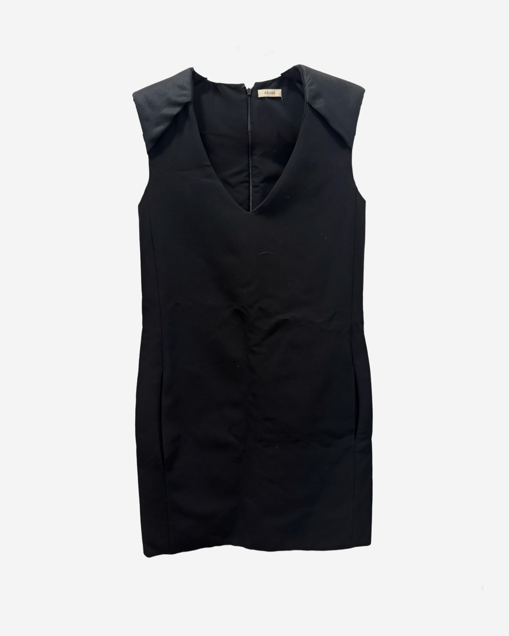 - Descripción: Vestido en color negro, cuello en v, sin mangas, bolsillos en los laterales, corte medio, detalles de pads en los hombros