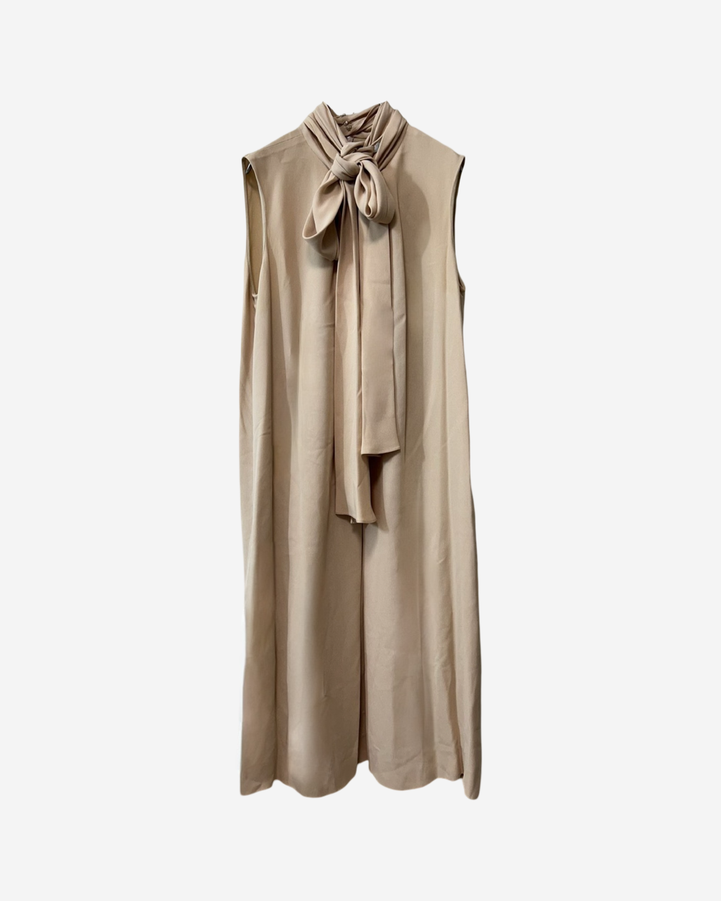 - Descripción: Vestido largo en seda color beige, sin mangas, moño en la parte frontal