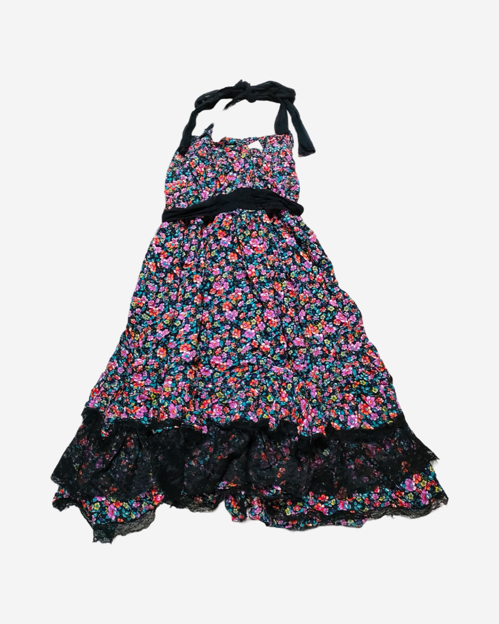 • Descripción: Vestido midi en print floral, detalles de encaje en la parte inferior, ajuste halter con listón